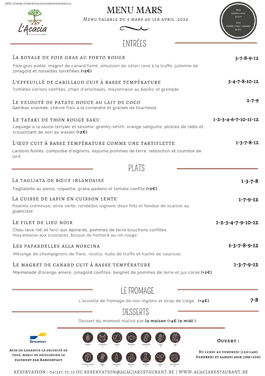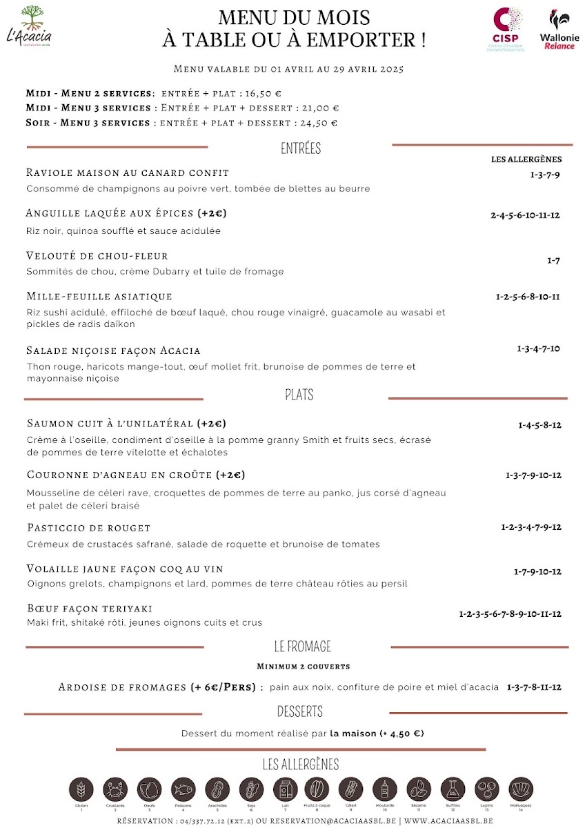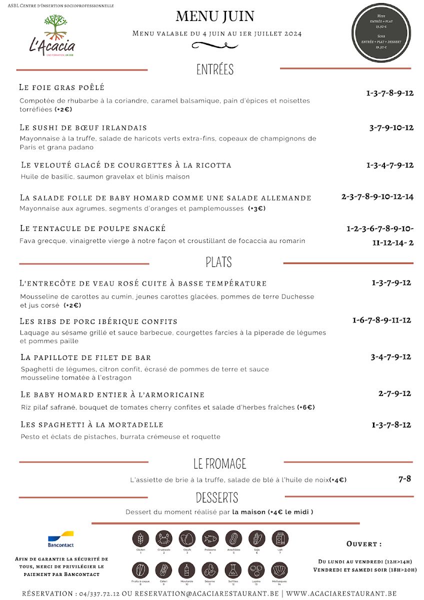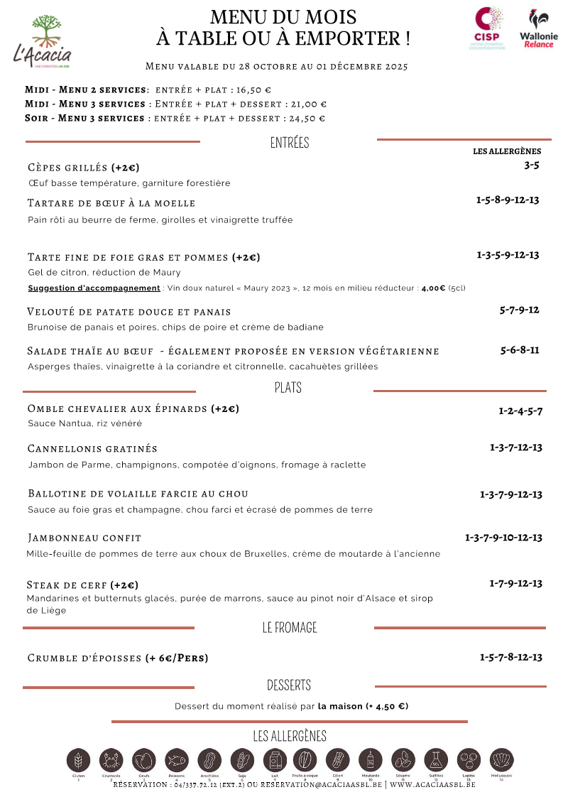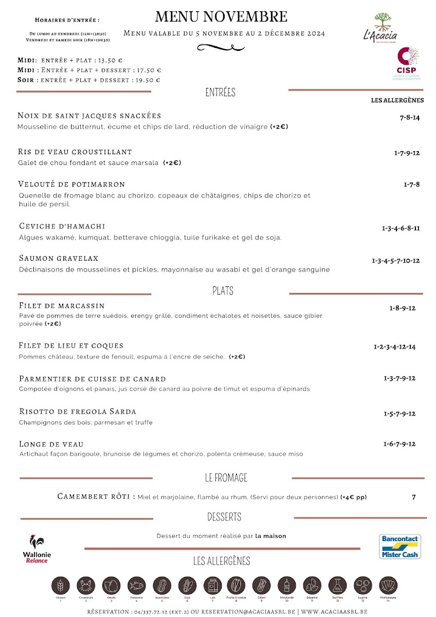 The menu at L'acacia - Training Center Horeca in Seraing reads like a confident showcase of classic technique and bold, well-judged flavors, with a clear focus on seafood, carefully handled meats, and composed plates that feel both refined and satisfying. Seafood stands out immediately: Raie brings a delicate, clean profile, while Thon Rouge delivers a richer, more structured bite that feels unmistakably premium. For those who enjoy bright, cured notes, Saumon Gravelax Maison offers a house-made touch that signals attention to detail, and the combination in La Terrine de Saint-Jacques Et Saumon Aux Écrevisses adds depth through layered textures and a more indulgent, shellfish-forward finish. If you prefer something more robust, Poulpe Pommes de Terre balances ocean character with comforting earthiness, and Fregola Sarda adds a Mediterranean accent that keeps the menu from feeling predictable.