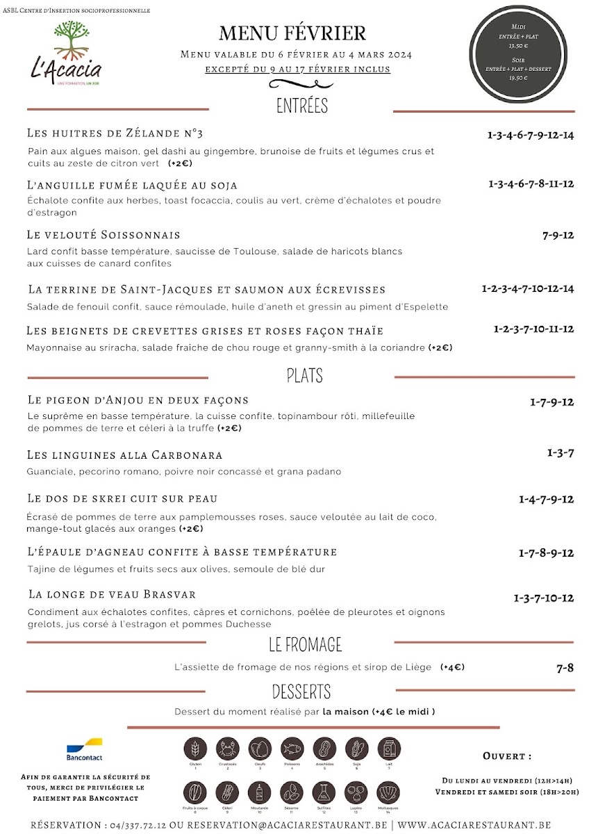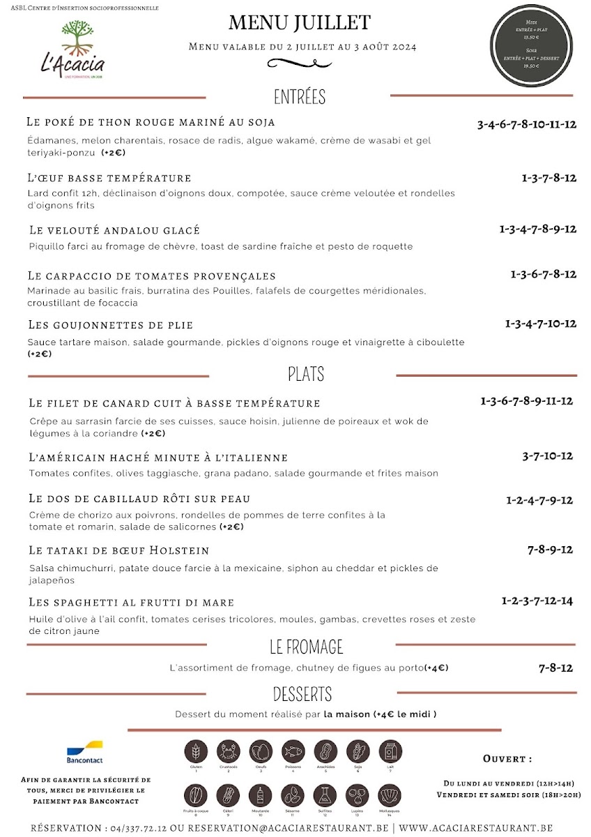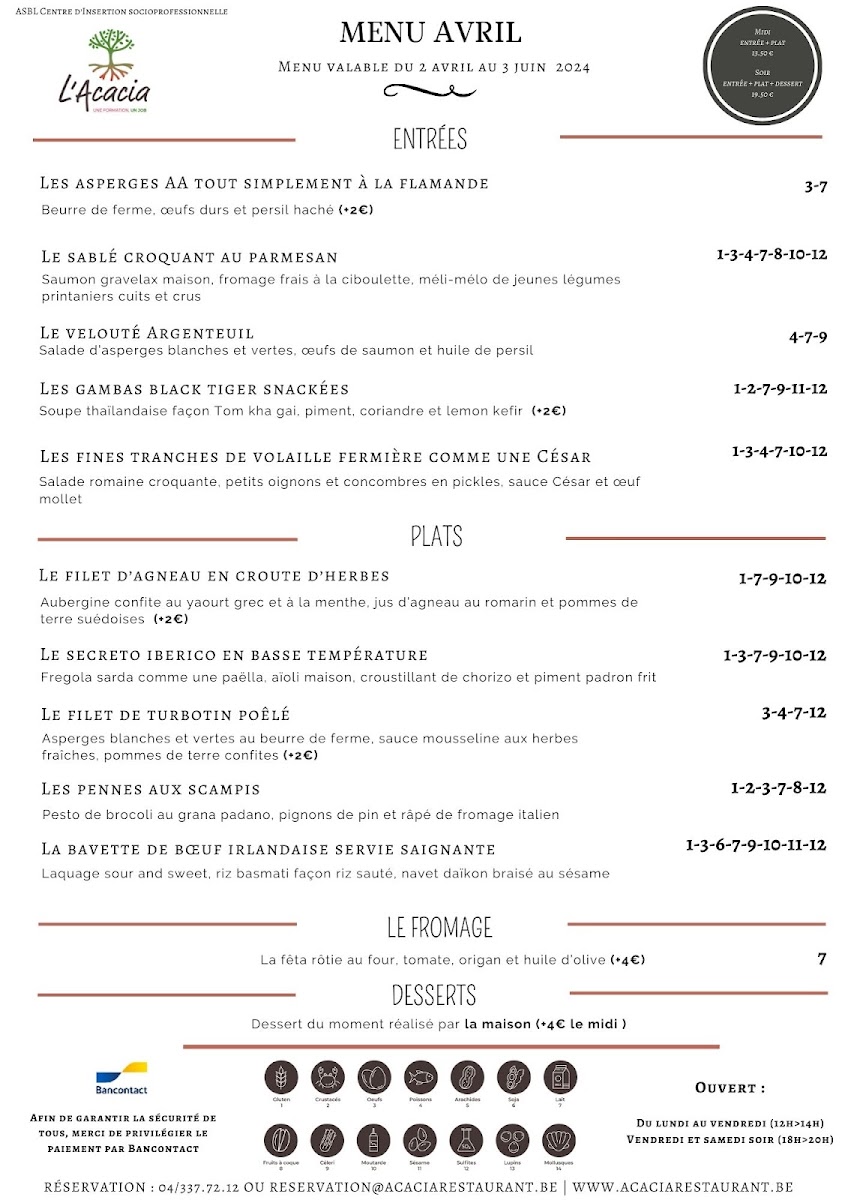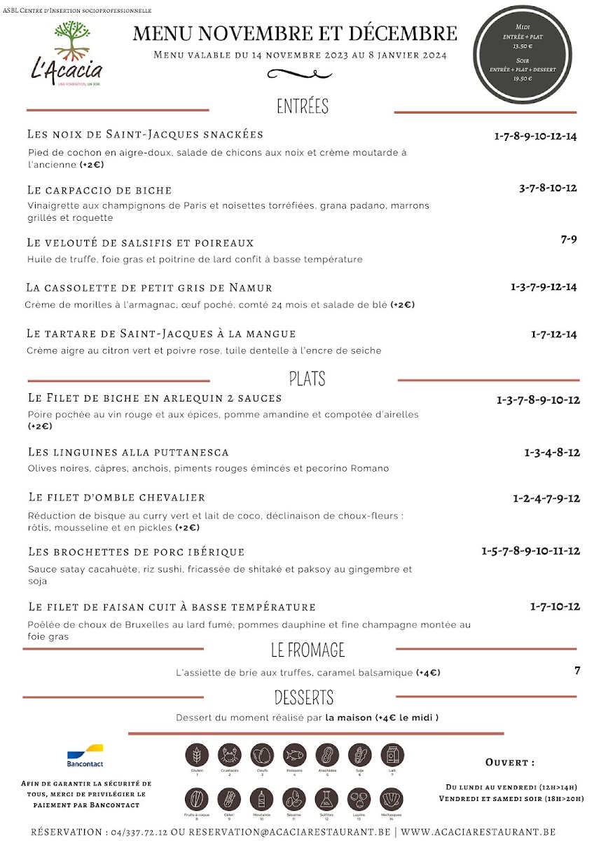 The menu at L'acacia - Training Center Horeca in Seraing reads like a confident showcase of classic technique and bold, well-judged flavors, with a clear focus on seafood, carefully handled meats, and composed plates that feel both refined and satisfying. Seafood stands out immediately: Raie brings a delicate, clean profile, while Thon Rouge delivers a richer, more structured bite that feels unmistakably premium. For those who enjoy bright, cured notes, Saumon Gravelax Maison offers a house-made touch that signals attention to detail, and the combination in La Terrine de Saint-Jacques Et Saumon Aux Écrevisses adds depth through layered textures and a more indulgent, shellfish-forward finish. If you prefer something more robust, Poulpe Pommes de Terre balances ocean character with comforting earthiness, and Fregola Sarda adds a Mediterranean accent that keeps the menu from feeling predictable.